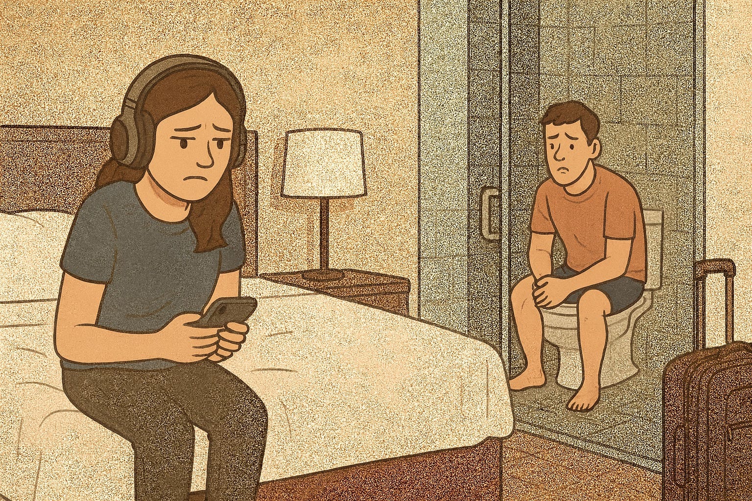 How do couples navigate sharing a toilet in the confines of a hotel room?